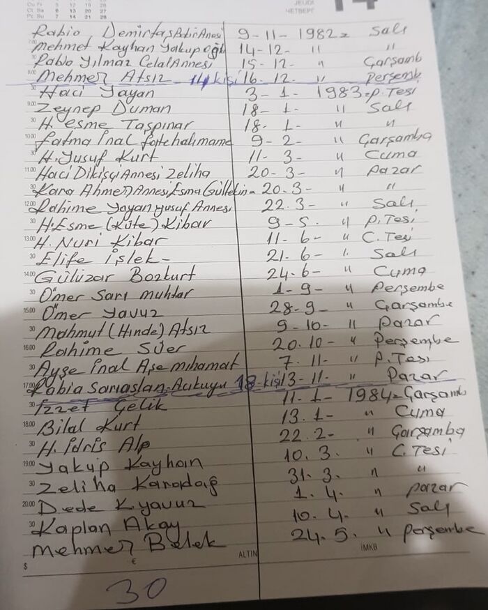 • Belge türü: El yazısı ölüm tarihleri listesi