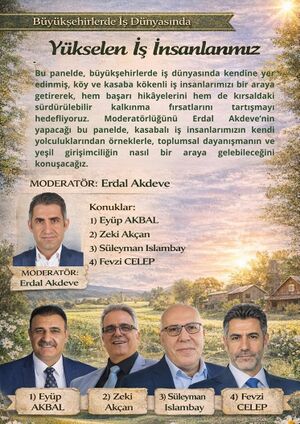 Erdal Akdeve moderasyonunda, kasabalı iş insanlarının kişisel yolculuklarından örneklerle; toplumsal dayanışma, yeşil girişimcilik ve yerel kalkınma başlıklarının nasıl birlikte ele alınabileceği değerlendirilecektir.